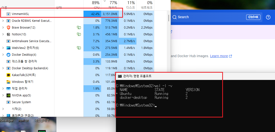 도커 사용하면 간혹 갑자기 컴퓨터가 느려지는 경우가 있으실거에요. 위 사진처럼 VmmemWSL이 메모리가 많이 잡고 있을거라 설정만 해두면 돼요. 그리고 Docker는 항상 켜둘 필요 없으니 사용하시고 끄시거나 시작 앱에서 제거하는 걸 권장해요. 우선 메모리를 정상으로 돌리기 위해 도커 끄고 WSL를 완전히 꺼주세요. 명령 프롬프트 관리자 모드에서 작성하시면 돼요.