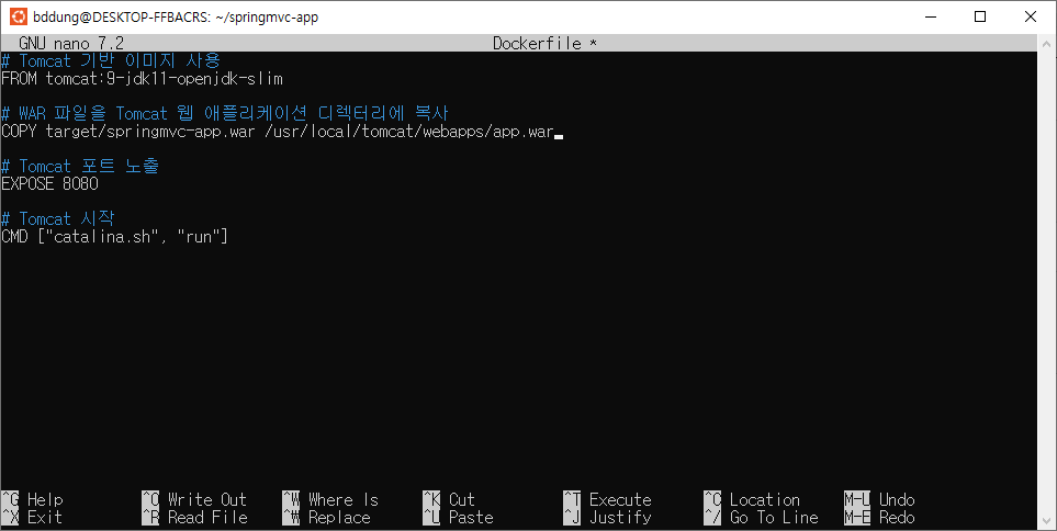 - COPY target/springmvc-app.war /usr/local/tomcat/webapps/app.war : 빌드된 WAR 파일을 Tomcat의 배포 디렉터리로 복사