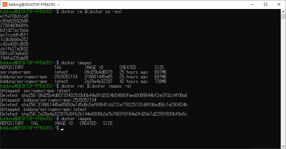 - 특정 이미지 삭제하기 : 특정 이미지만 삭제하고 싶다면 아래 명령어를 사용합니다.예를 들어 bddung/springmvc-app라는 이미지를 삭제하려면 아래 코드와 같이 입력합니다.