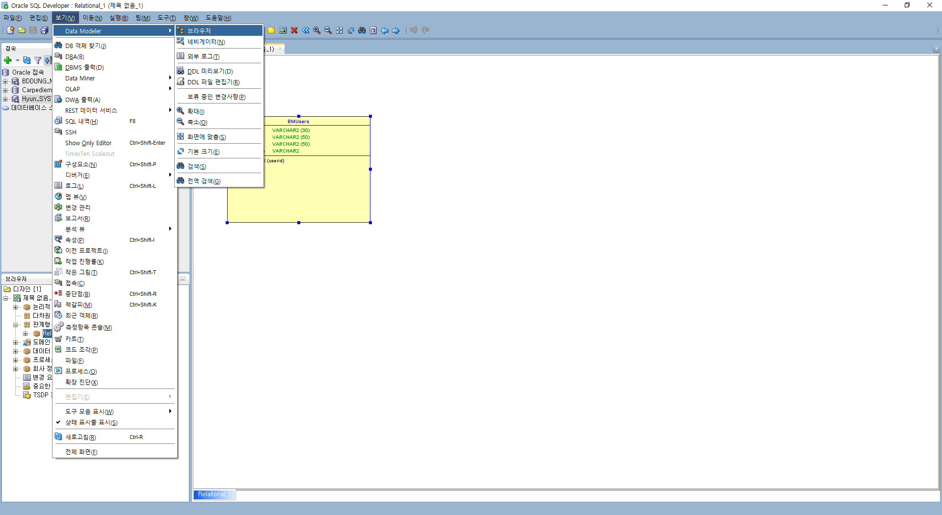 SQL Developer 위 창에서 보기 > Data Modeler > 브라우저 순서대로 클릭하시면 왼쪽 아래 창에 브라우저가 뜨는데 관계형 모델 오른쪽 마우스로 클릭 후 새 관계형 모델 클릭하시면 다이어그램을 제작할 수 있는 창이 나오게 됩니다. 맨 아래 사진에 나와있는 빨간 네모칸에서 테이블, 외래키 설정 및 확대 등 편하게 제작할 수 있습니다.