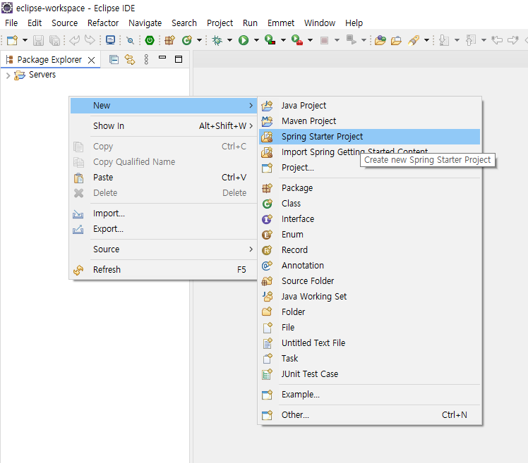왼쪽 Package Explorer에서 오른쪽 마우스 클릭 후 Spring Starter Project 클릭해서 프로젝트명, 빌드 방식, 언어 및 버전 클릭 후 Next 누르고 필요한 라이브러리 설정해주시고 Finish 누르시면 됩니다.